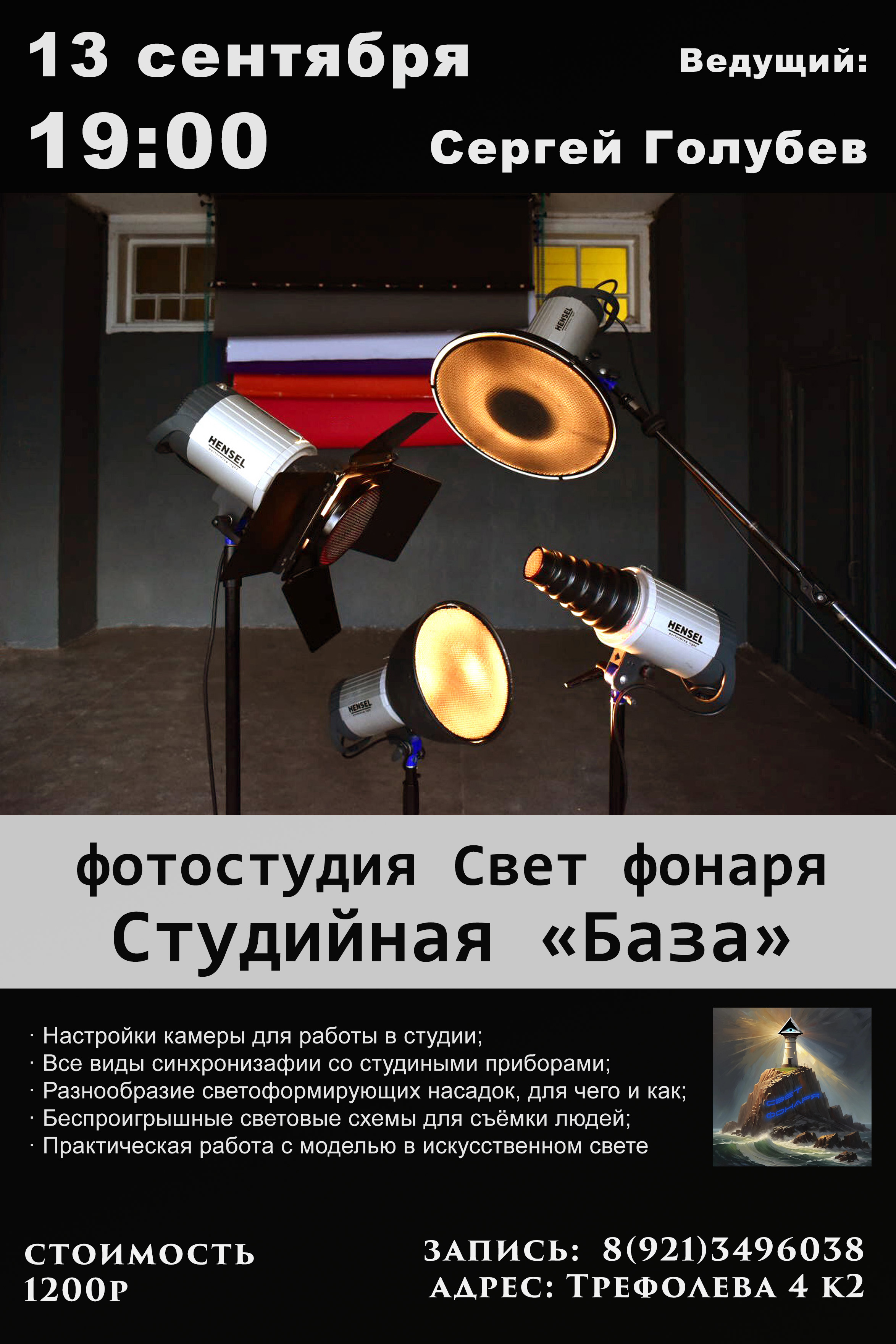 13 сентября Мастеркласс по студийному свету в студии Фотостудия "Свет фонаря". Трефолева 4к2 начало в 19:00